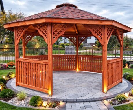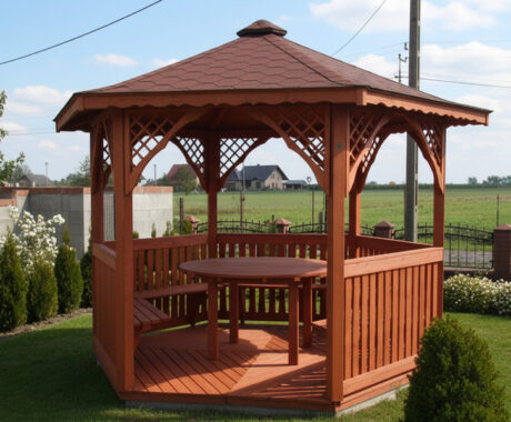Zahradní altán ARIZONA má tvar šestiúhelníku a je vyroben ze sušeného borového dřeva. Tvoří jej 6 nosných sloupů o rozměrech 9×9 cm a dokonale zaručují bezpečnost v každém počasí. Zahradní altán ARIZONA ø 320 cm má celkovou výšku ve štítu přibližně 270 cm. Sloupy jsou osazeny na podlaze s hranolovou konstrukcí (5x4 cm), kterou spojují z masivní střechou, pokrytou kvalitním finským asfaltovým šindelem. Výška nosných sloupů po střechu je 200 cm. Podlahová plocha altánu je 6,5 m². Prostor mezi sloupy vyplňuje pevné laťkové zábradlí s možností vynechání pro vstup do altánku. Součástí altánu je dřevěná podlaha stůl a 5 lavic, které pohodlně usadí 10-15 lidí.