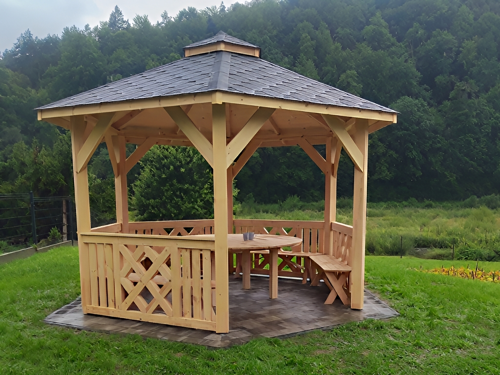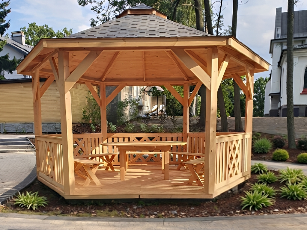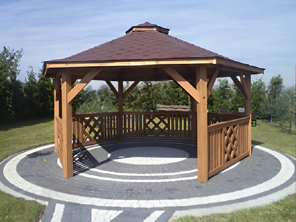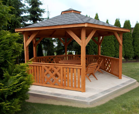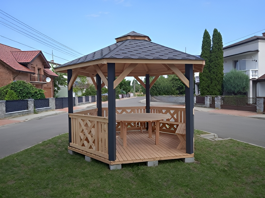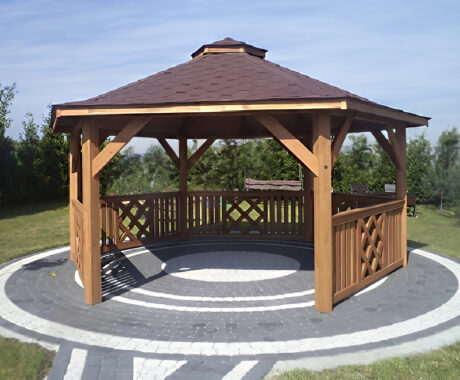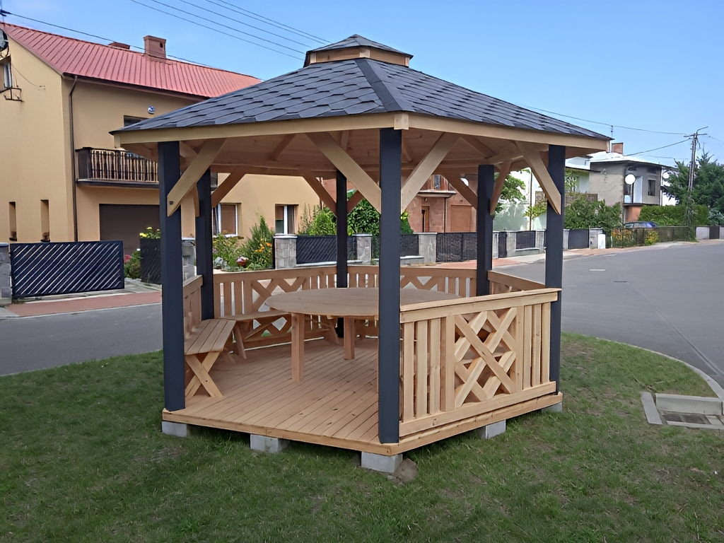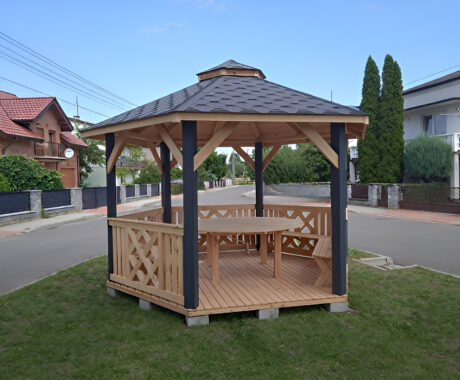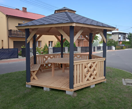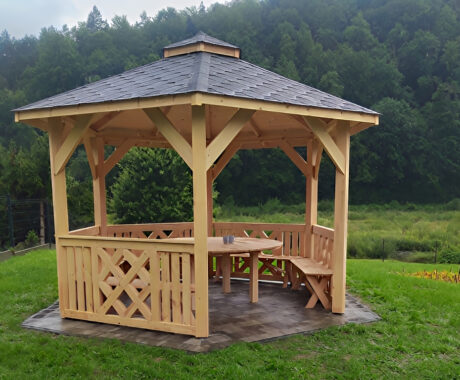 Zahradní altán DAKOTA má tvar šestiúhelníku a je vyroben ze sušeného borového dřeva. Tvoří jej 6 nosných sloupů o rozměrech 13×13 cm a dokonale zaručují bezpečnost v každém počasí. Jsou osazeny na podlaze s hranolovou konstrukcí (5x4 cm), kterou spojují z masivní střechou, pokrytou kvalitním finským šindelem. Zahradní altán DAKOTA má celkovou výšku ve štítu přibližně 270 cm. Podlahová plocha altánu je 10 m². Výška nosných sloupů po střechu je 230 cm, celková výška po sedle střechy je 270 cm. Prostor mezi sloupy vyplňuje pevné laťkové zábradlí, jehož vzor se střídá. Možnost vynechání zábradlí pro vstup do altánku. Součástí altánu je dřevěná podlaha.