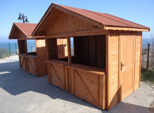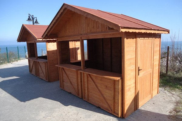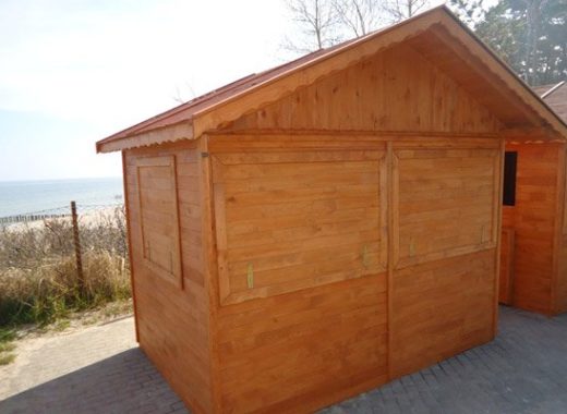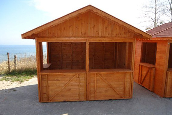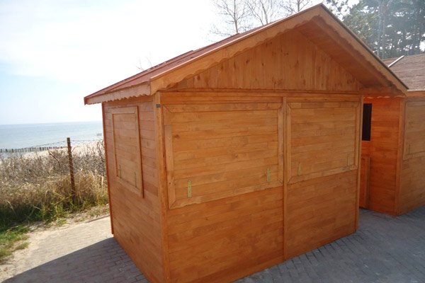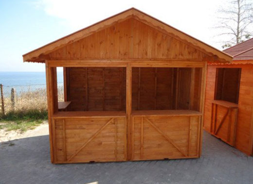 Stěny jsou zpevněny hranolovou konstrukcí s možností dodatečného zateplení z vnitřní strany, čímž se rozšiřuje využitelnost stánku i během chladnějších měsíců. Výška stěn 200 cm a výška po hřeben 270 cm vytvářejí komfortní pracovní prostor, přičemž střecha se sklonem 23° je tvořena boazériovou deskou a pokryta kvalitním finským asfaltovým šindelem.