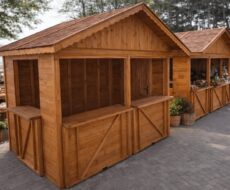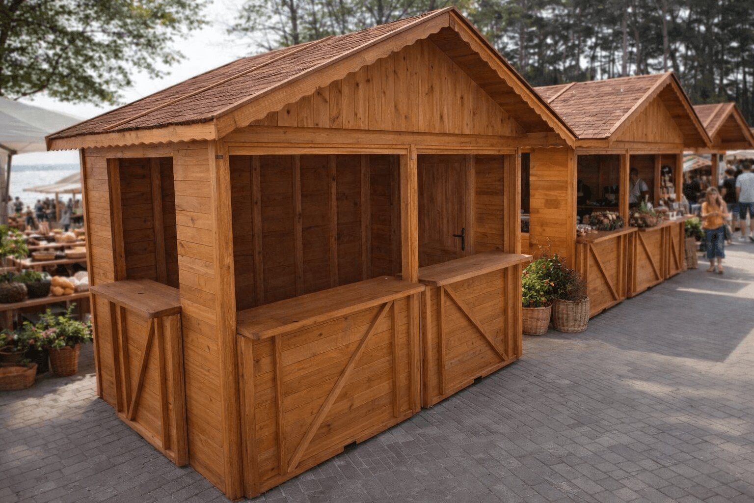 Prodejní stánek KOLN o rozměrech 300x200 cm a sedlovou střechou nabízí spolehlivé řešení pro sezónní i celoroční prodej. Je vyroben ze sušeného borovicového dřeva o tloušťce desky 25 mm systémem pero-drážka, což zajišťuje pevnost, stabilitu a dlouhou životnost konstrukce. Přední část střechy s přesahem 50 cm vytváří krytý prostor nad pulty a účinně chrání zboží i pracovní plochu před nepříznivým počasím.