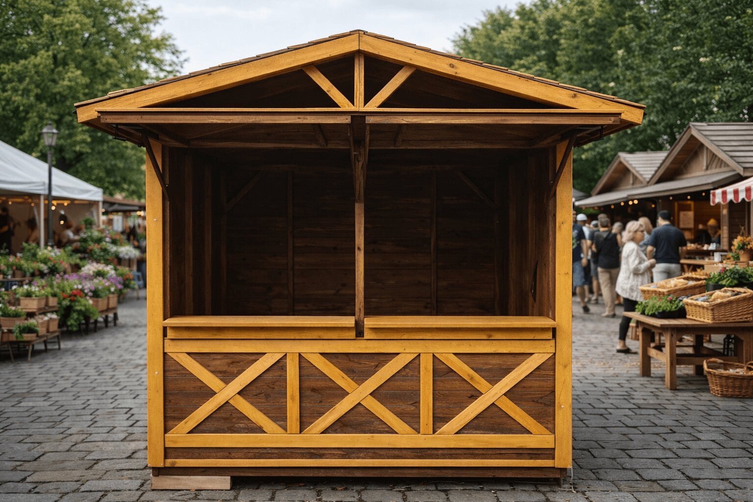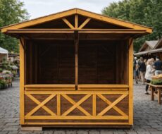 Prodejní stánek BONN o rozměru 240×200 cm a sedlovou střechou nabízí kompaktní, ale efektivní řešení pro sezónní i příležitostný prodej. Konstrukce ze sušeného borového dřeva zajišťuje pevnost a odolnost. Přední část střechy přesahuje přibližně 60 cm, čímž vytváří krytý prostor nad pultem a zároveň chrání vystavované zboží před deštěm či sněhem.