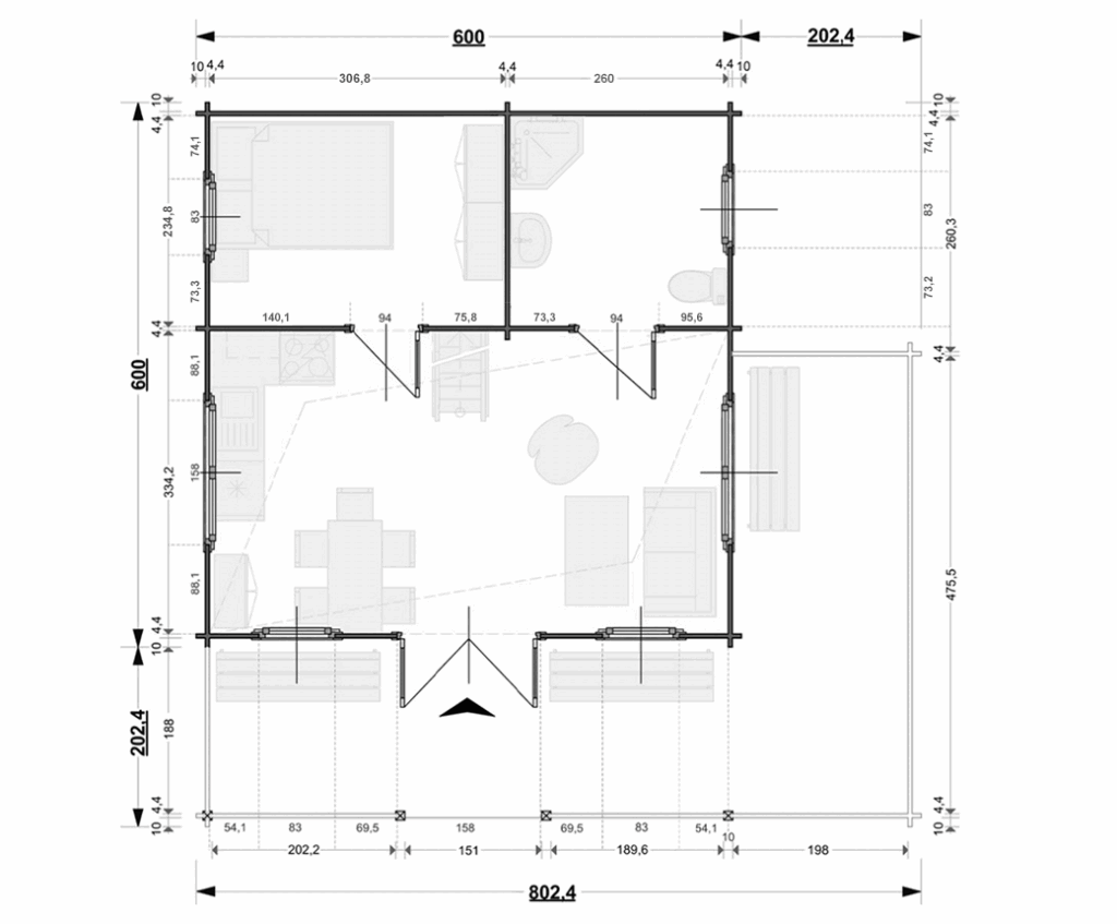 - Celkový rozměr: 802 x 802 cm (včetně terasy ve tvaru L)